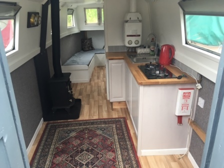 This is a nice little boat, clean and dry, newly renovated and insulated throughout, rewired and new shower and plumbing throughout. The toilet is in the form of a ‘portaloo’ with removable cartridge. New free standing multi-fuel stove with vertical flue. Small 12v fridge built within the galley cupboards and above is the two ring gas cooker. Sleeps 2 when the single ‘V’ berth converts to a double bed with aid of the central support.